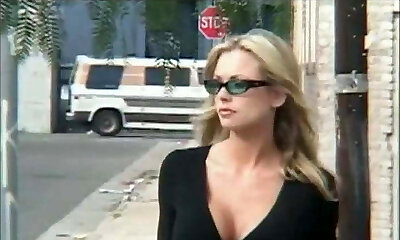 Huge-titted blonde in latex corset gets pulled by pussy lips in BDSM clip