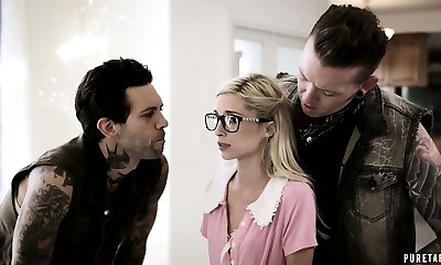 身材矮小的光头发在眼镜吹笛者Perri获取面部后xxx帮派爆炸